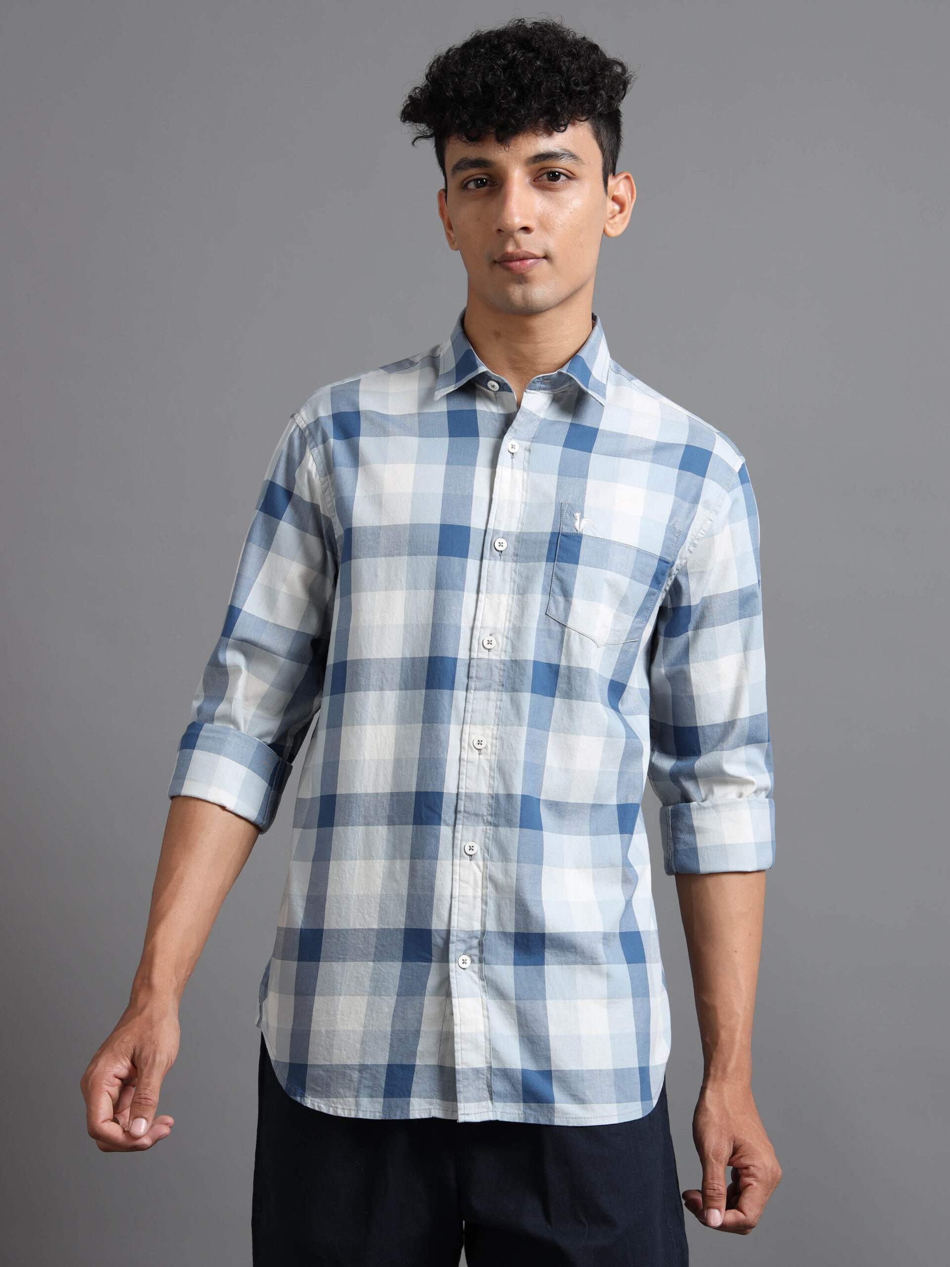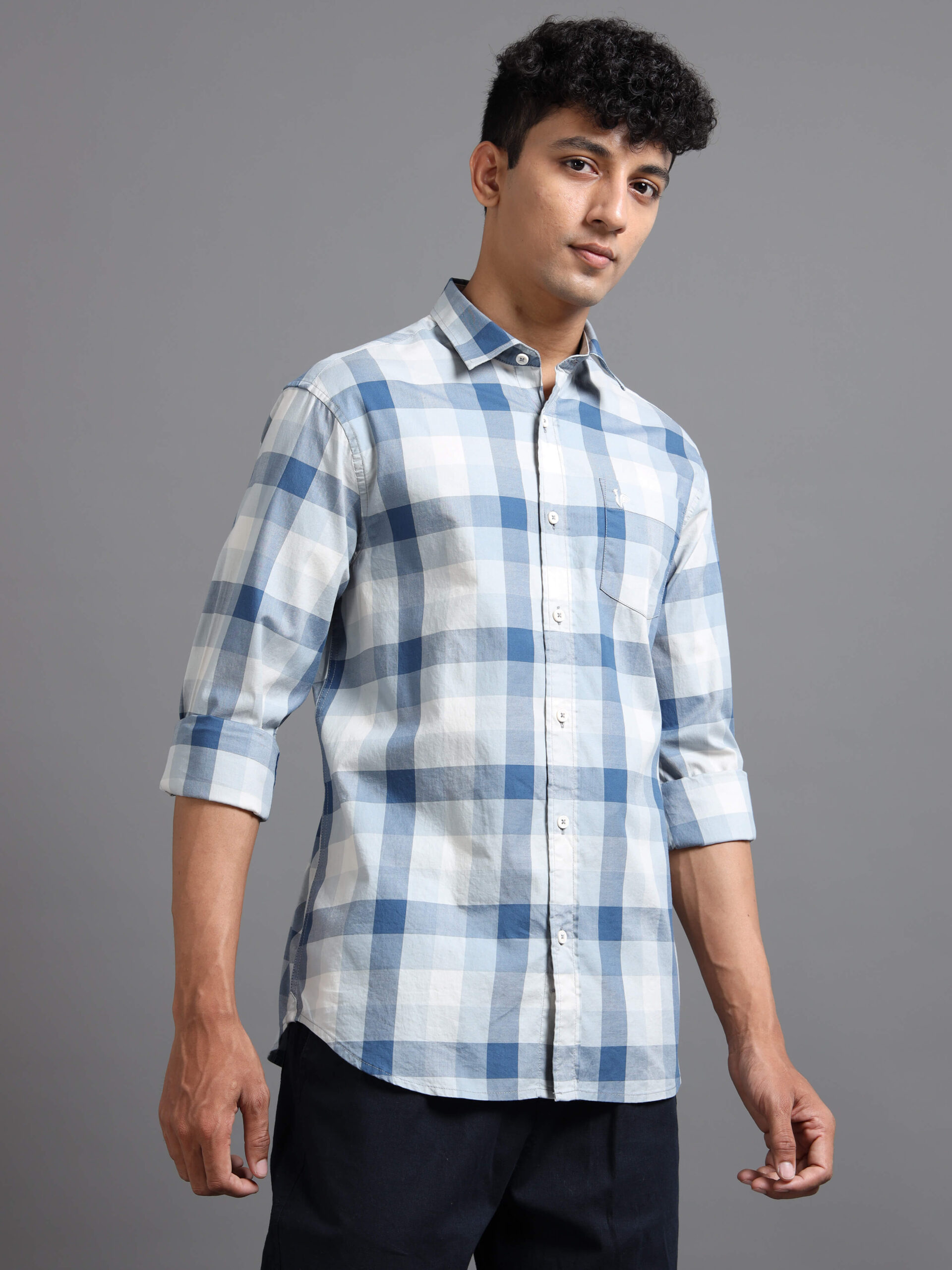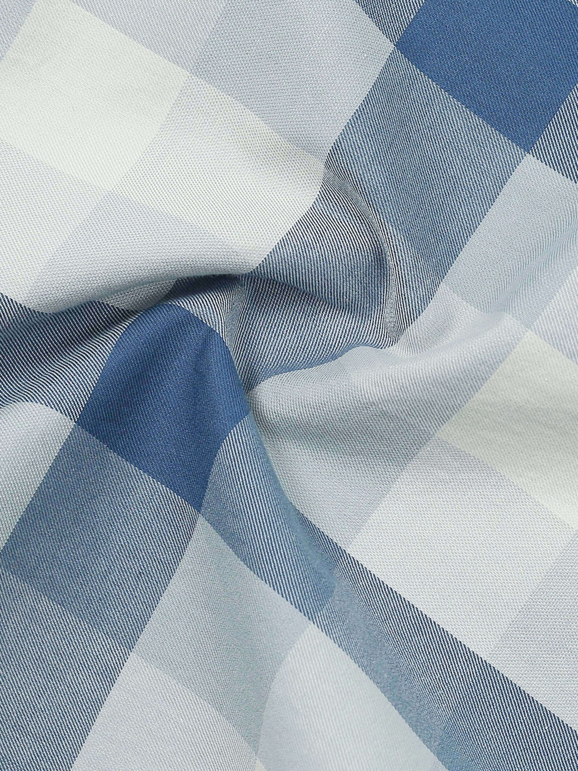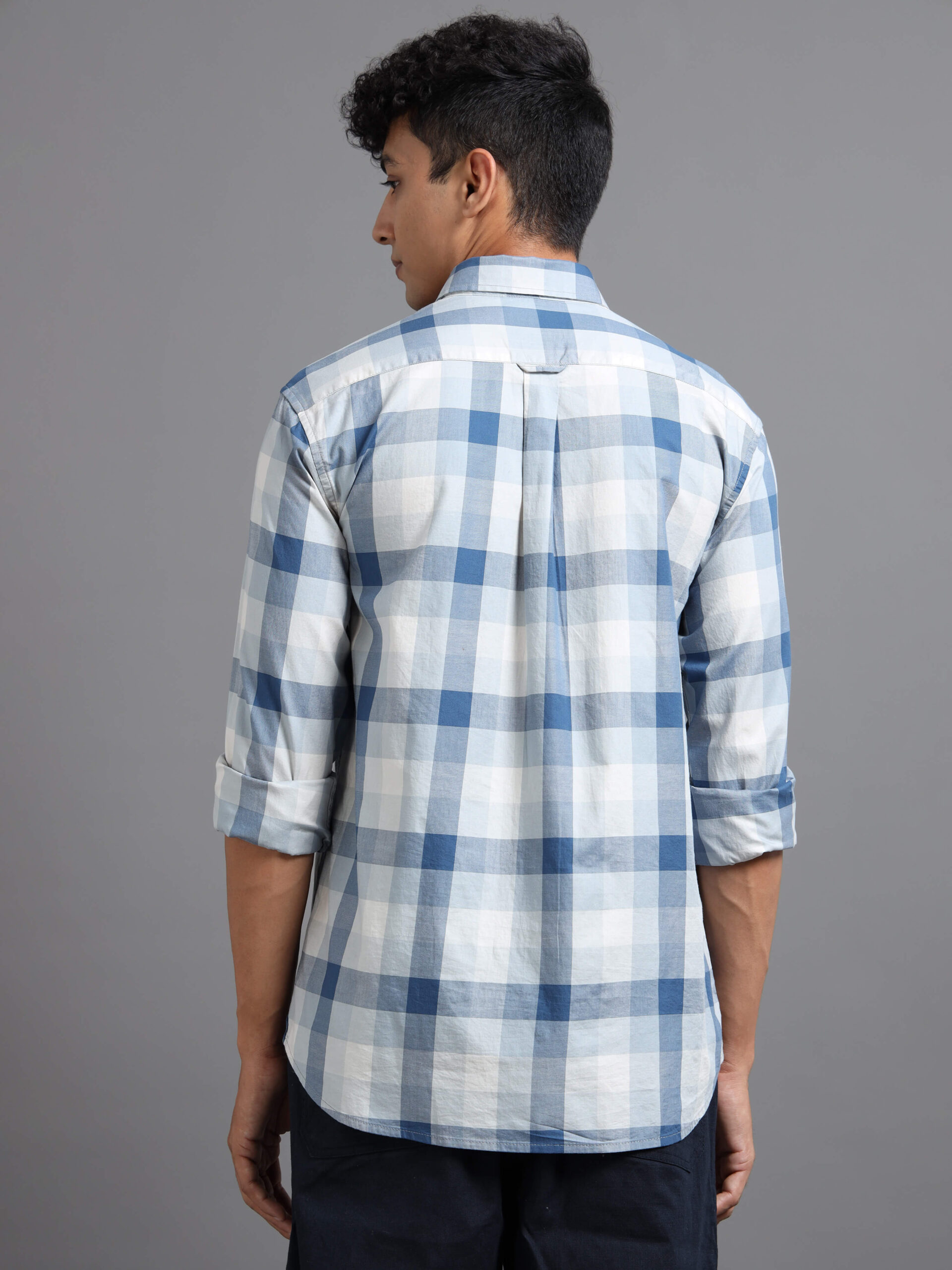 Discover modern sophistication with our tailored shirt featuring a dynamic geometric design: a bold vertical band anchors the piece while horizontal stripes in varied intensities intersect to form a striking grid of squares.